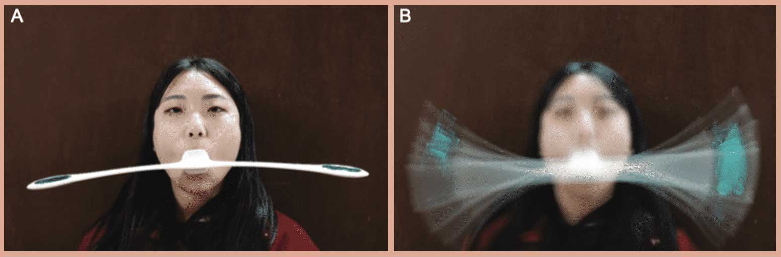 Facial muscle exercise using the Pao device. (A) The mouthpiece of the device is held in the center of the mouth using the lips; (B) oscillatory movement of the device results from nodding the head up and down vigorously. (Source: Ui-jae, H., Aesthetic Surgery Journal 38(5):2018.)